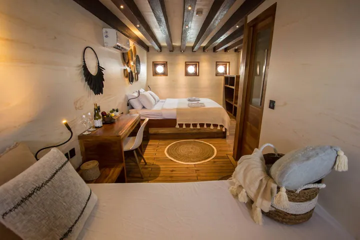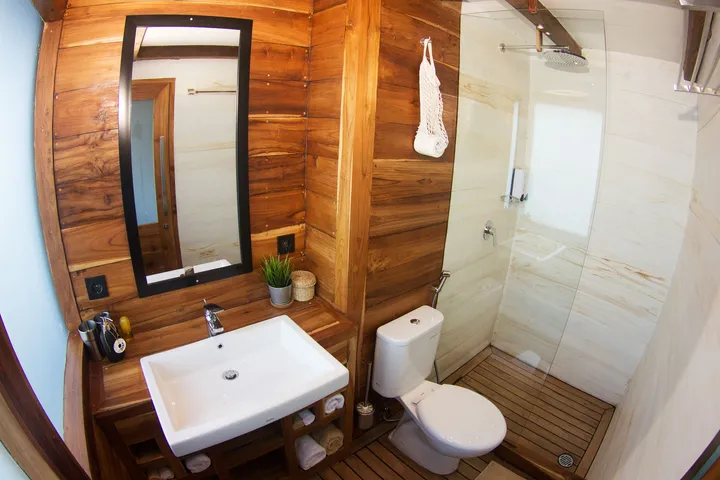 The Fenides phinisi offers luxury liveaboard diving throughout the Indonesian archipelago. Newly built in 2019 and designed with a contemporary feel and modern furnishings to create the ideal home-from-home. There are just 5 spacious cabins on board to cater for a maximum of 11 guests, which includes 1 luxury master cabin and 2 twin and 2 double cabins. Each is outfitted with the finest linen, air-conditioning, world-class TV and media systems, and expansive, fully-fitted en-suite bathrooms. The Fenides liveaboard boasts ample living space, including the salon and bar equipped with Bose sound and panoramic views, al-fresco dining and a comfortable sundeck with loungers.