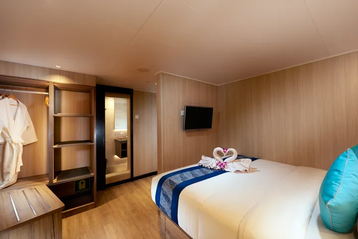 The beautiful Gaia Love liveaboard offers year-round luxury dive trips in Indonesia. The 40m liveaboard caters to just 22 guests in 11 spacious cabins, featuring private en-suite bathrooms, ample storage space, individually controlled AC, and all average 20sqm in size. The upper deck cabins also have large picture windows and private outdoor balconies. The Gaia Love is spread over 4 decks and features a contemporary, modern design. Social areas include an indoor salon and dining room, outdoor lounge and dining area, spacious partially covered sun deck, and an al-fresco bar.