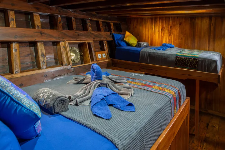 Built in Sulawesi, which is considered the “boatyard” of Indonesia, Jelajahi Laut is a beautiful phinisi boat constructed in 2021 with local teak wood and ironwood, ready to take you to the hottest dive spots in Indonesia. Jelajahi Laut means “Explore the Sea,” which is exactly what she delivers with expeditions to Komodo, Raja Ampat, Banda Islands, Alor, and Ambon, just to name a few. This traditional phinisi was designed by divers, optimizing the comforts for diver guests with a spacious equipment area and camera station, where you can gear up and prepare for your underwater adventure.