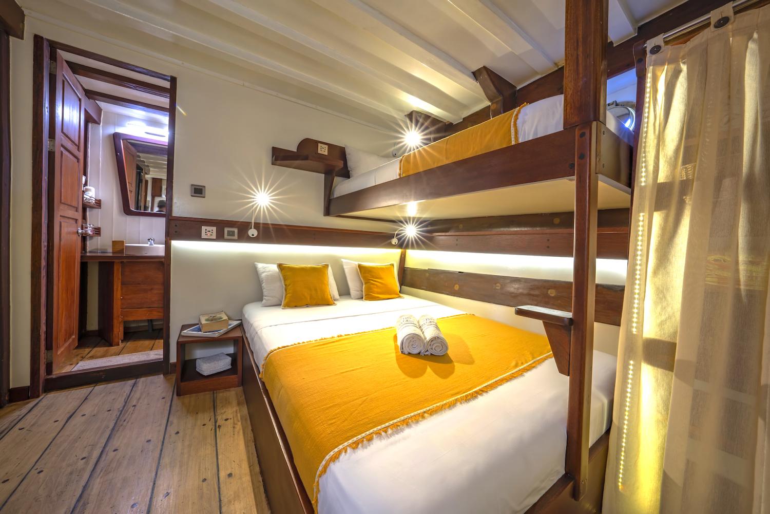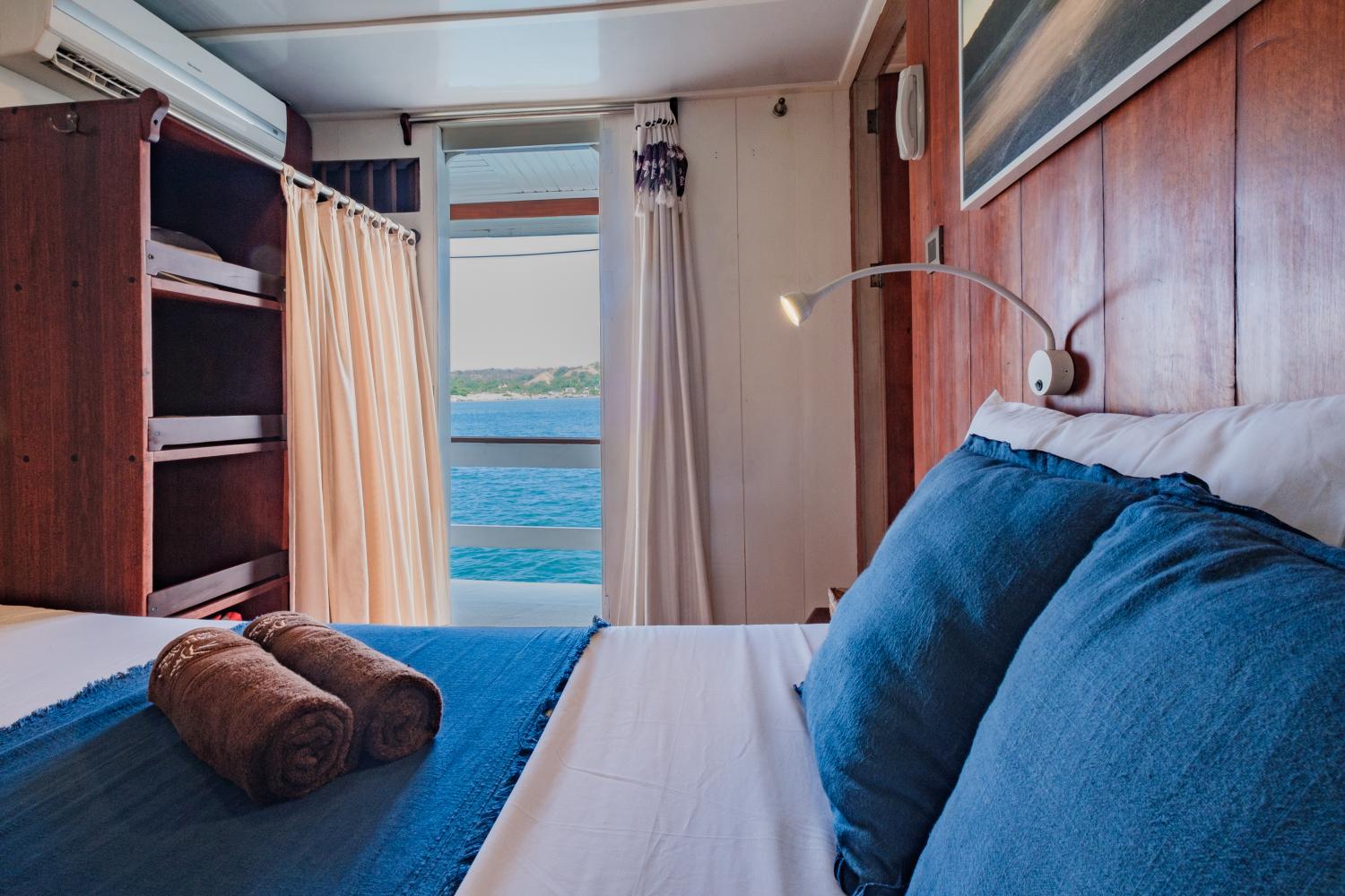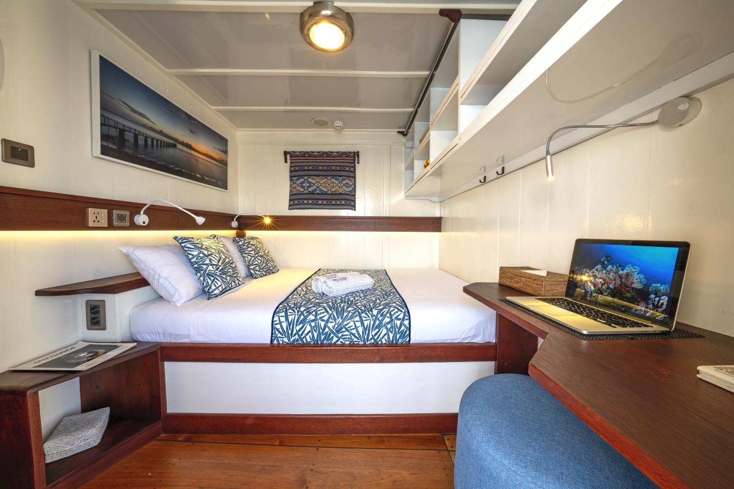 The 32-meter long wooden boat hosts 16 divers in absolute comfort. Traditionally built from Ironwood and other tropical hardwood, the boat is specially designed to offer the best liveaboard scuba diving cruise experience. The air-conditioned restaurant on the main deck also serves as the place to brief divers before each dive. There is a large flat screen in the middle of the room: photographers and videographers use it to present their captures and footage at the end of the day. An inside lounge, large shadow deck areas, a Sundeck complete the common parts.