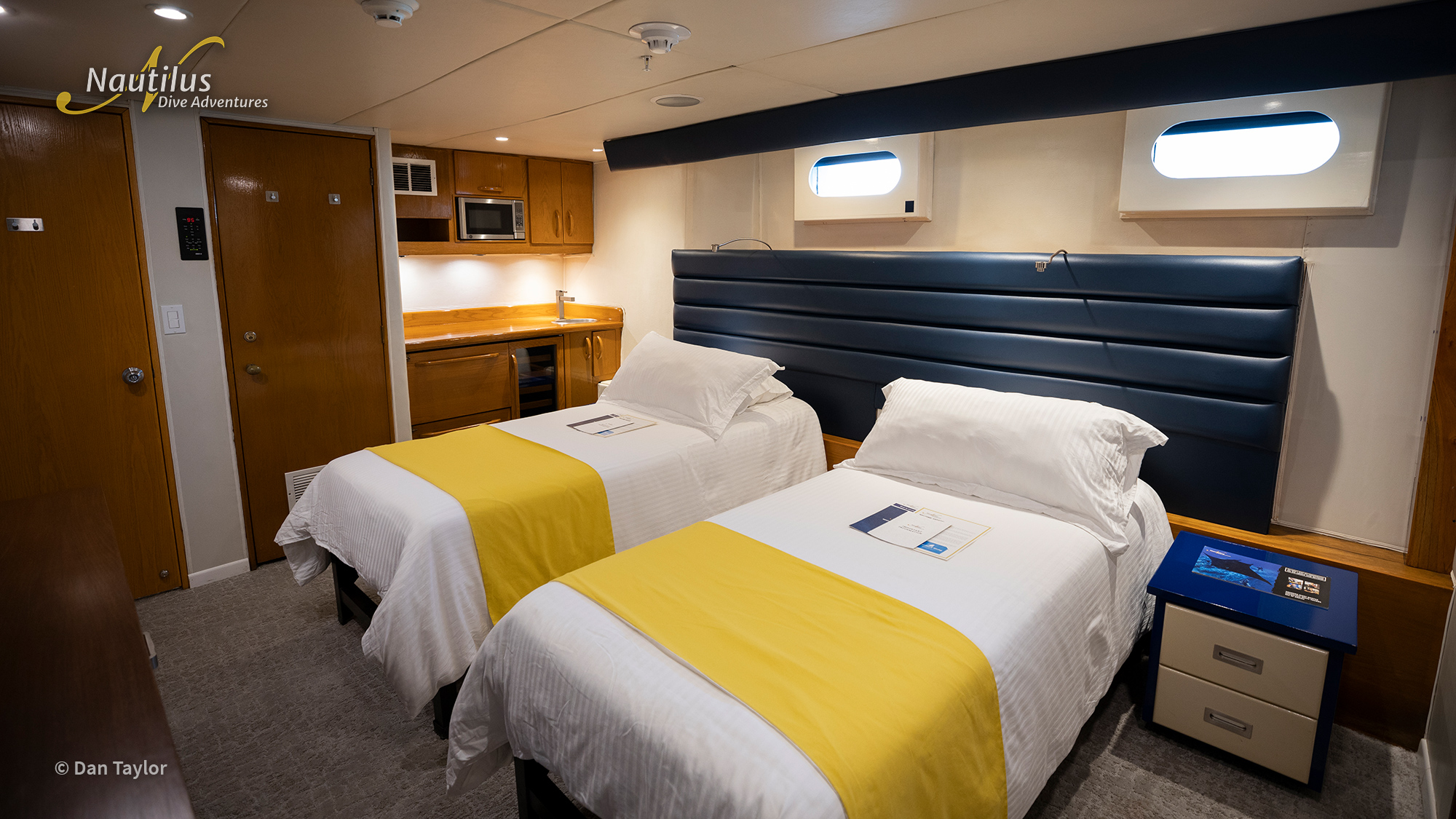 Imagine a 116 foot yacht that accommodates small groups of 12 divers in 6 large suites. Our beautiful Gallant Lady combines the luxury of a yacht with the thoughtful design of a dive deck built for divers. The yacht features a main lounge and dining room with wrap-around view, large water level platform, sky lounge, sun deck and even a crow’s nest. With 1700 horsepower Caterpillar engines and hydraulic stabilizers, the Lady can speed you wherever you want to go in great comfort.