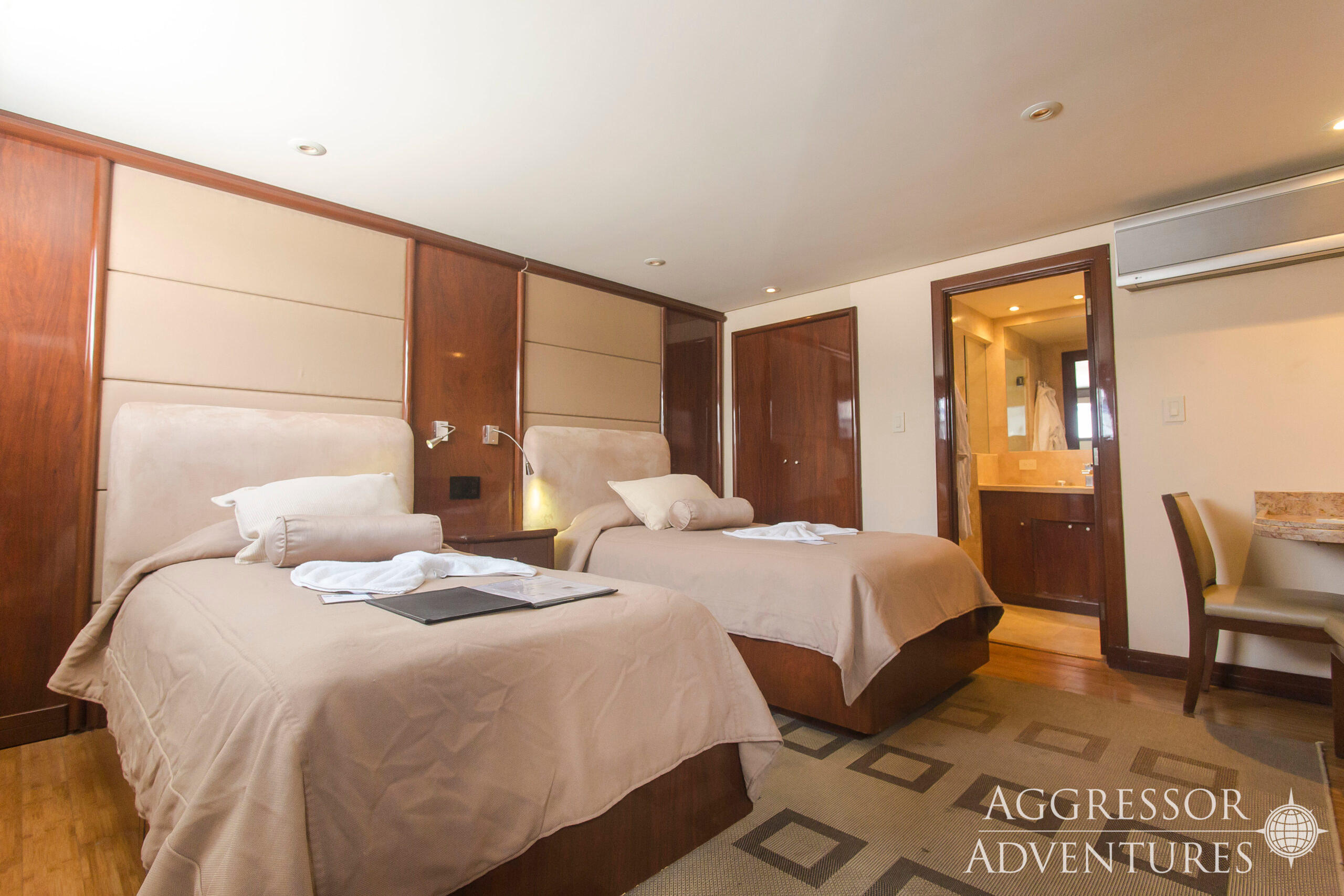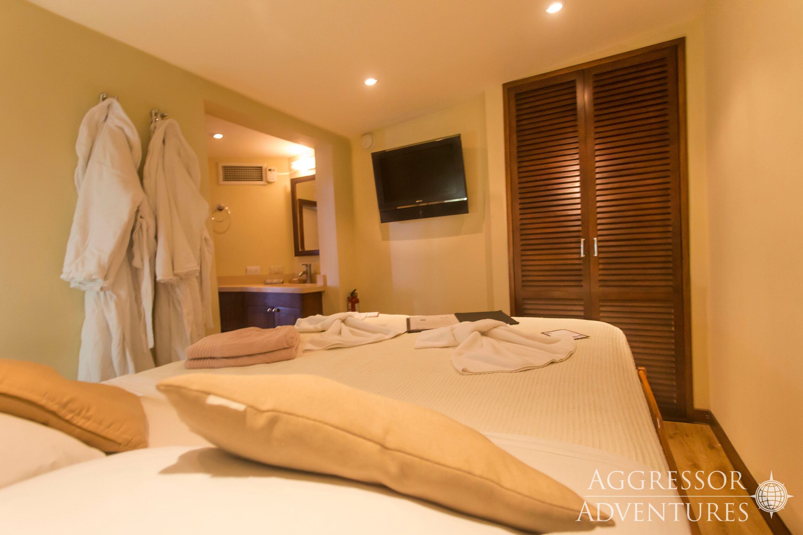 The Okeanos Aggressor II is a 120’ yacht, built and powered for comfort, safety and stability. She is diesel-powered, cruises at 10 knots and has 110-volt power on board. Comfortable accommodations for 22 guests include 9 deluxe staterooms with double bed lower and twin bed upper, 1 master deluxe stateroom with a queen bed, and 2 suites of which one has two twin beds and the other a king bed. Each stateroom features a private bathroom and shower.