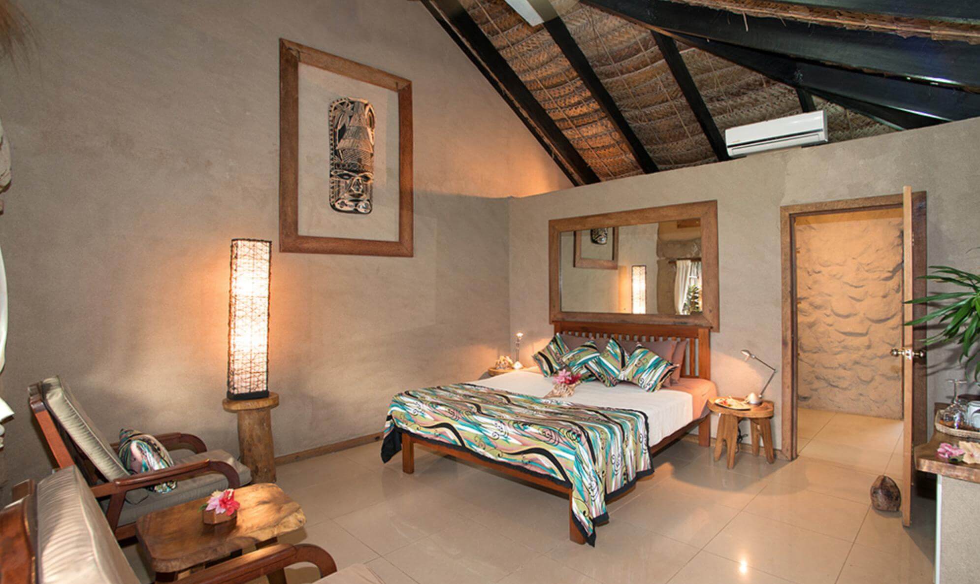 The resort provides air-conditioned oceanfront bures and vales, each with king beds, private lava-rock garden showers, and spacious decks. A complimentary air-conditioned camera room supports underwater photographers, while general amenities include beachfront dining areas and hammocks for sunset views. No on-site spa or gym mentioned; focus remains on diving and island exploration.