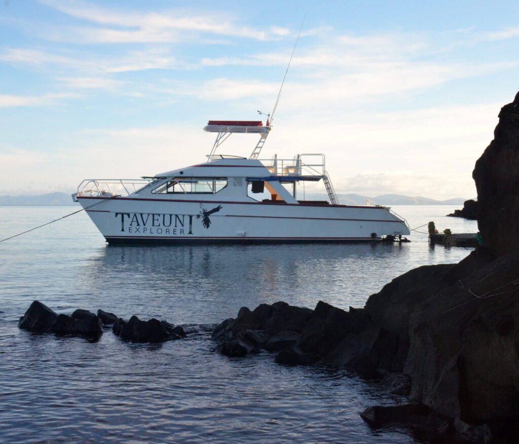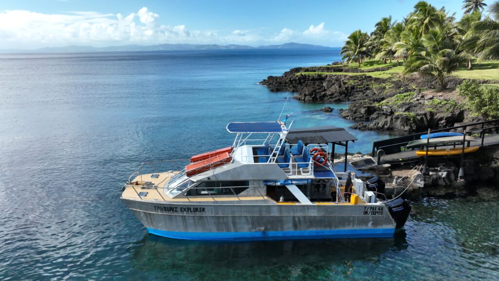The on-site Paradise PADI Dive Center uses top vessels: Taveuni Explorer (26 divers, with galley, bathroom, shower) and Lady Paradise (12 divers). Nitrox available; staff manages gear transport. Night diving offered; courses from beginner to advanced.