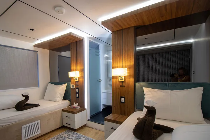 The Red Sea Aggressor IV is a 43.5 meters/142.7 feet long liveaboard sailing from Port Ghalib in Egypt’s Red Sea. The Red Sea Aggressor IV can take up to 26 passengers in 13 staterooms designed for maximum comfort. The 3 master staterooms feature a queen bed, while 9 deluxe rooms come with twin beds. All cabins have individual air conditioning and private bathrooms, and a hair dryer. Plus, every room has a 32-inch television with a selection of 400 movies, TV shows, and documentaries. The large sundeck and its shaded area are perfect for relaxing. Guests can unwind in a hot tub or socialize with fellow divers in the bar or the salon, where there are fish identification presentations, movie nights, and games.