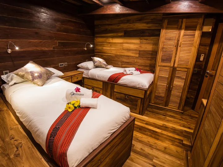 On board the Samambaia, the 18 experienced, professional, and friendly crew are on hand to help to create an unforgettable journey. Guests are catered to with delicious international cuisine cooked fresh daily with locally sourced ingredients and freshly prepared bread and pastries. For relaxation, guests can choose the partially shaded sundeck with comfortable loungers and enjoy the spectacular Indonesian views or a relaxing massage from the onboard masseuse.