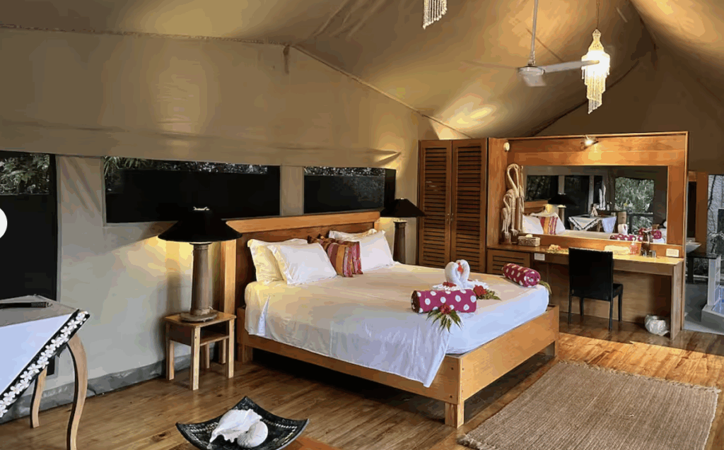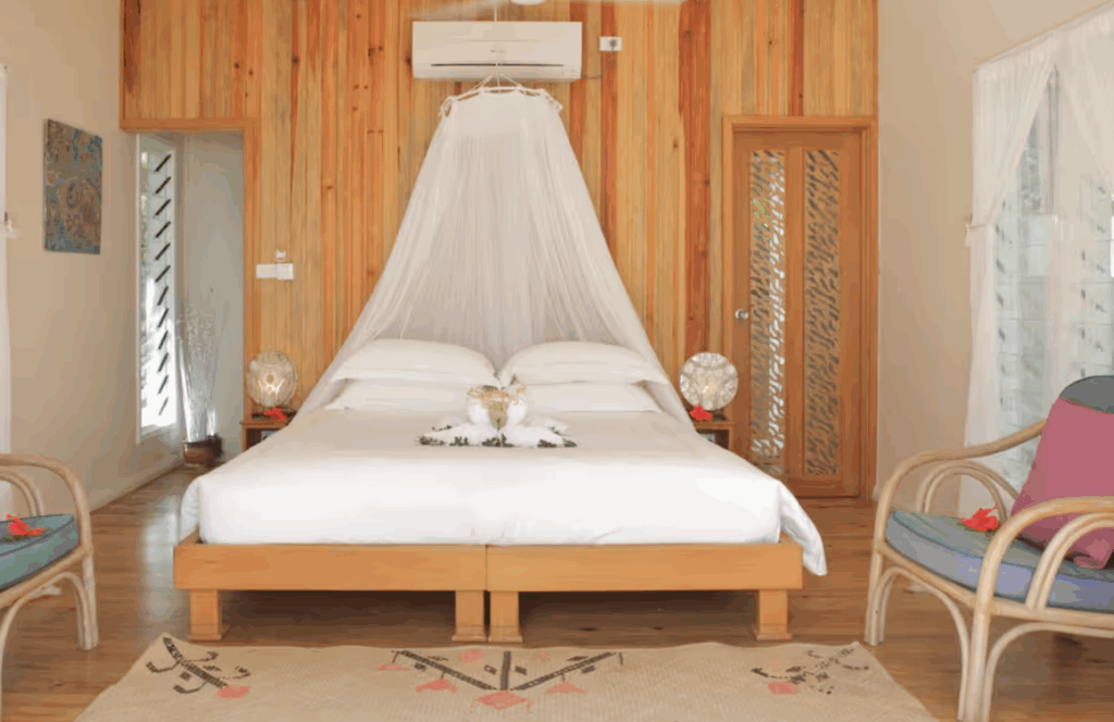 Complimentary in‑room Wi‑Fi, air‑conditioning in most bures, and thoughtful in‑room touches like French press coffee, a stocked minibar, and turndown service.