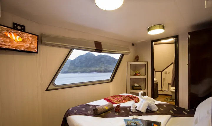 The M/V Thailand Aggressor is a 35m world-class liveaboard offering year-round diving trips in the Andaman Sea. Catering to 16 guests, the Thailand Aggressor has 8 staterooms equipped with a private bathroom and shower, ample storage, a hair dryer, fresh towels, a TV and media player, and individual climate control. On the upper deck is the large indoor dining room, which serves a delicious menu featuring a variety of Western and local Thai cuisine. Soft drinks, iced tea, beer, and wine are complimentary. Guests can relax in the open-air lounge and enjoy the sun deck with a jacuzzi, loungers, deck chairs, bar service, and CD/stereo player.